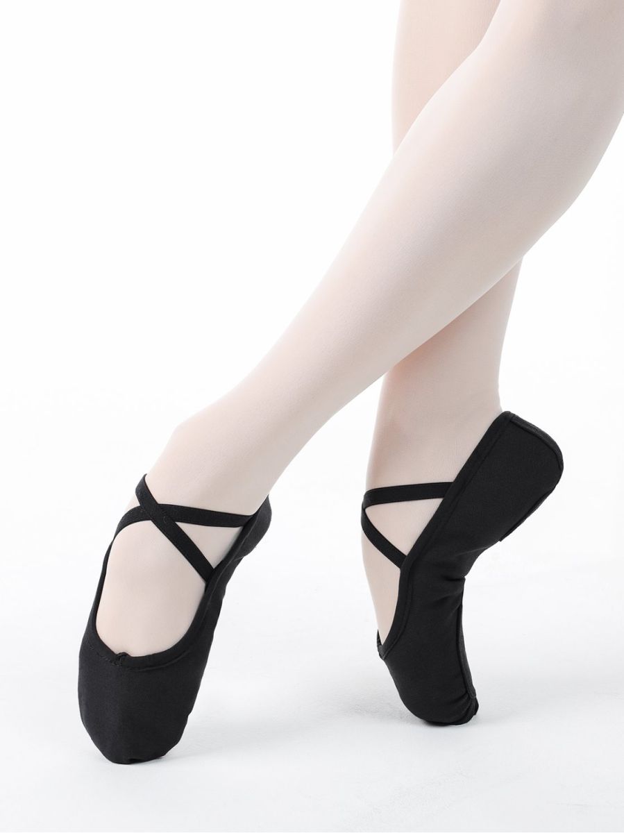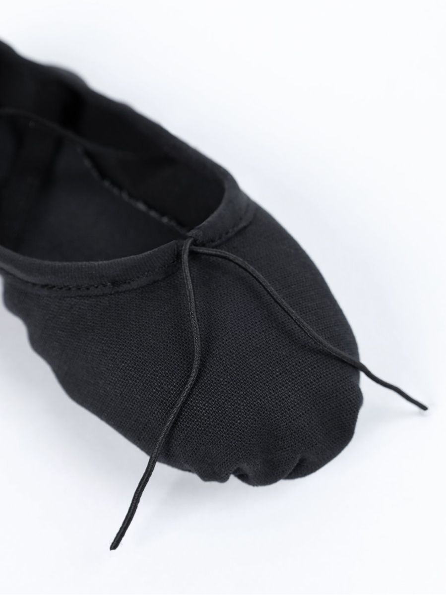 Балетные мягкие туфли (балетки) чёрного цвета средней закрытости Плотная и прочная ткань отлично поддерживает стопу. Внутри – хлопчатобумажная стелька. Раздельная подошва из натурального спилка. Резинки пришиты. Для лучшей фиксации на ноге предусмотрен продетый под окантовочной тесьмой шнурок. Классические балетки идеально подходят для занятий танцами.
