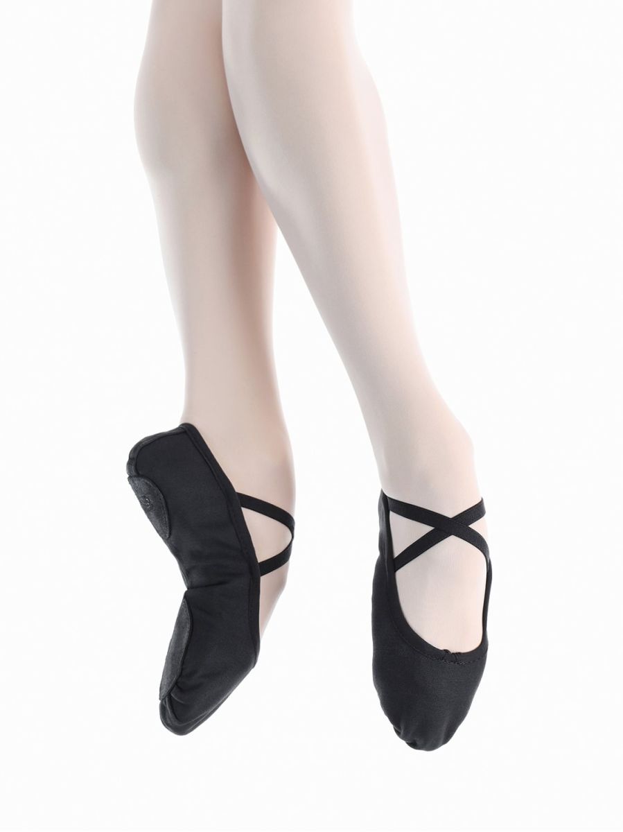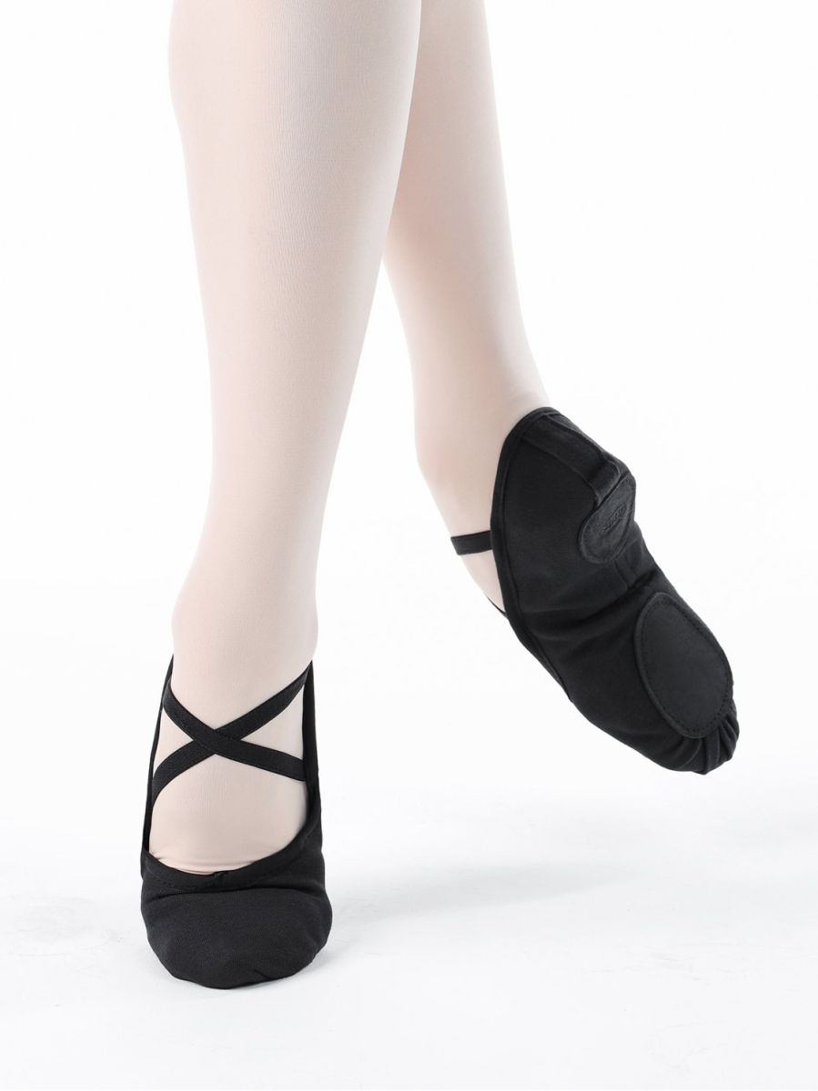 Балетные мягкие туфли (балетки) чёрного цвета средней закрытости Плотная и прочная ткань отлично поддерживает стопу. Внутри – хлопчатобумажная стелька. Раздельная подошва из натурального спилка. Резинки пришиты. Для лучшей фиксации на ноге предусмотрен продетый под окантовочной тесьмой шнурок. Классические балетки идеально подходят для занятий танцами.