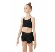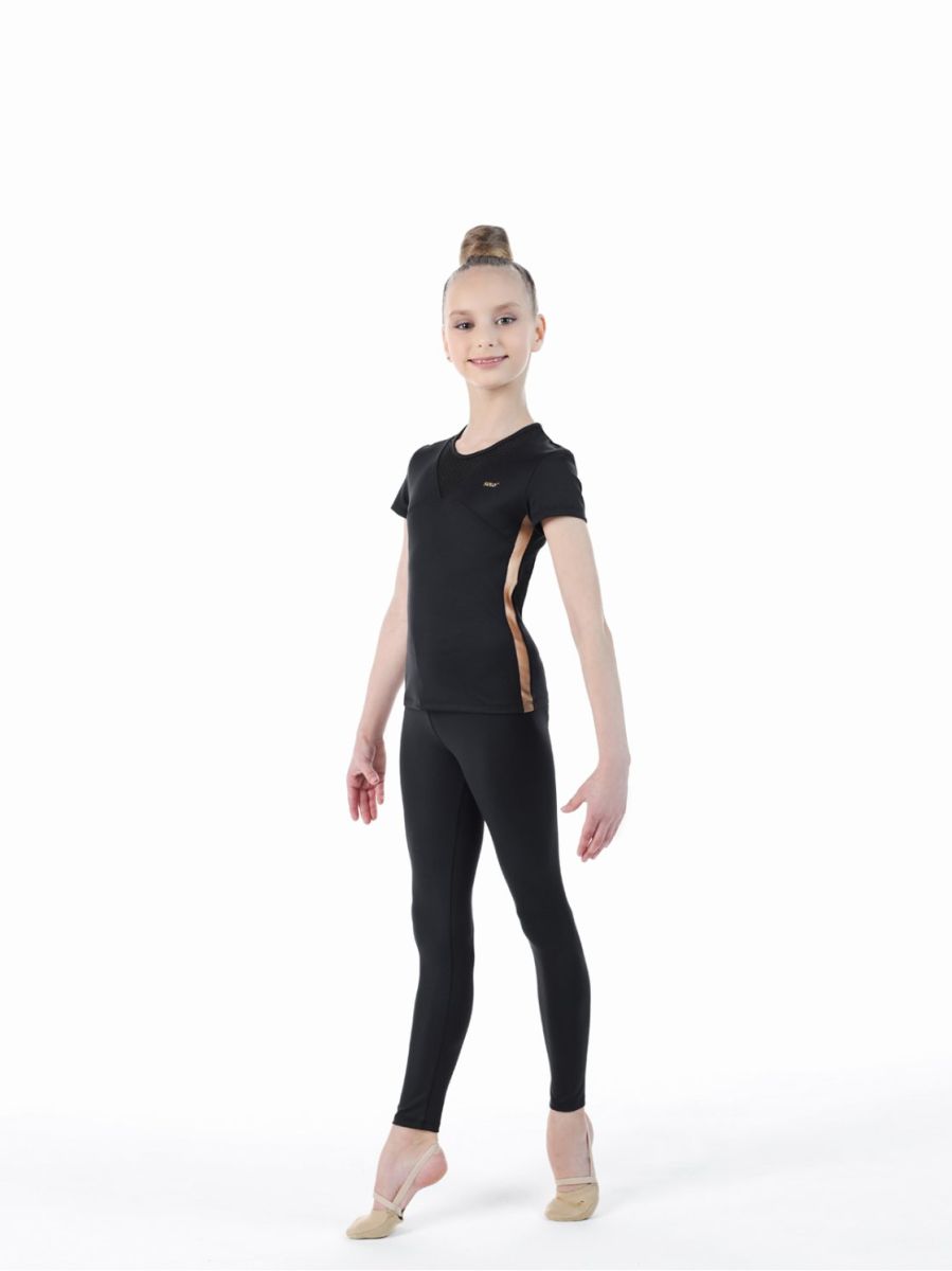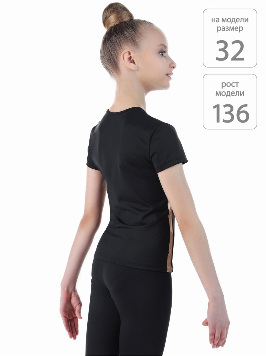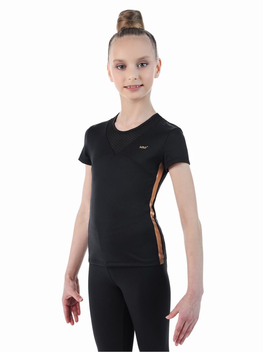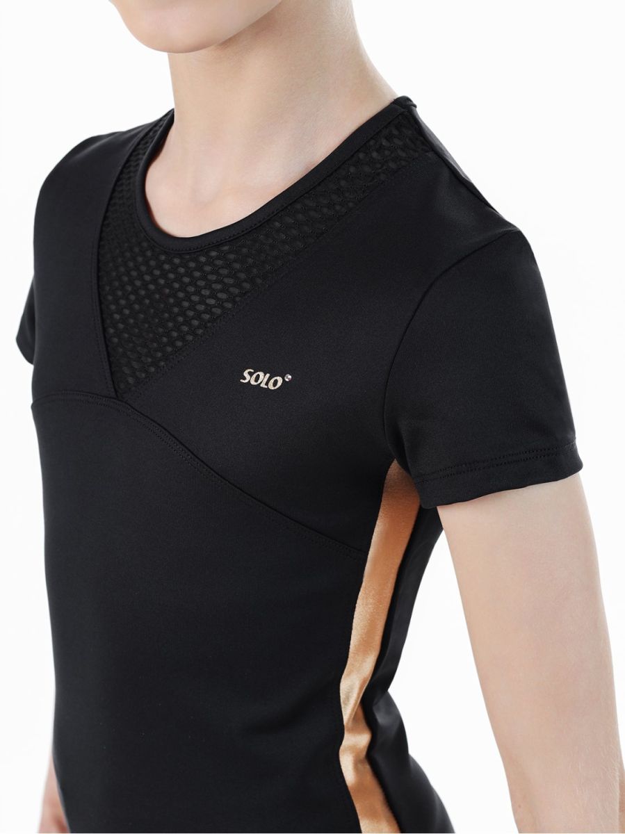 Футболка из мерила с коротким рукавом. Сочетание трёх фактур разного цвета: *матовый чёрный полиамид Meryl *глянцевая золотая отделка *полупрозрачная чёрная «сетка» Золотистый лого SOLO со сверкающей стразой. Комбинирование коллекции«Звезда Solo» с другой продукцией нашего бренда позволит восходящим юным «звездам» создать образы в стиле СПОРТ+МОДА.