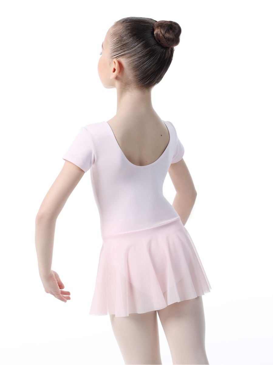 Классическая модель купальника цвета розовый зефир с полупрозрачной юбкой-солнце из сетки, с короткими рукавами. Круглый выкат спинки до середины лопаток, средний окат ножки.