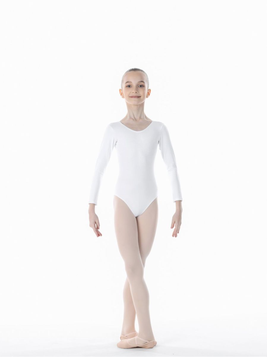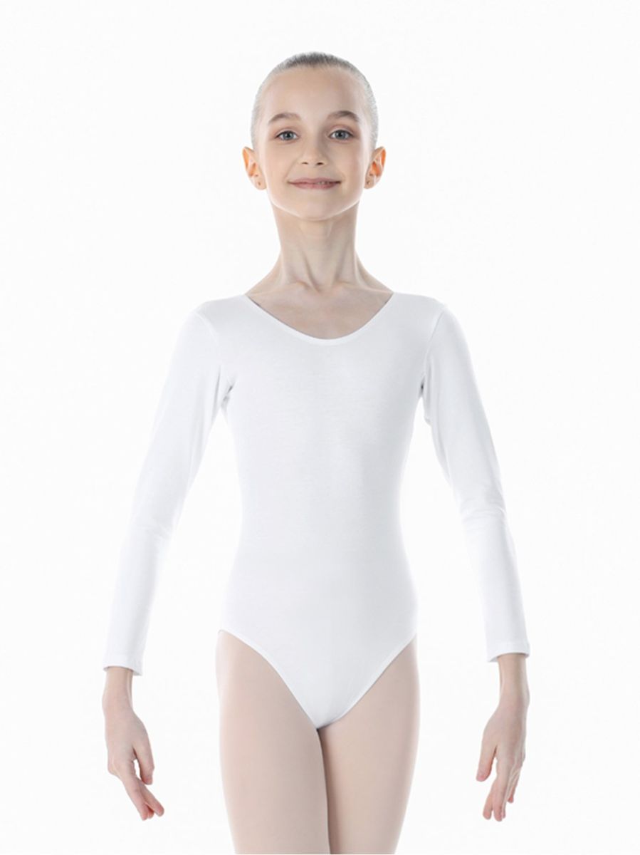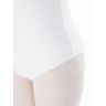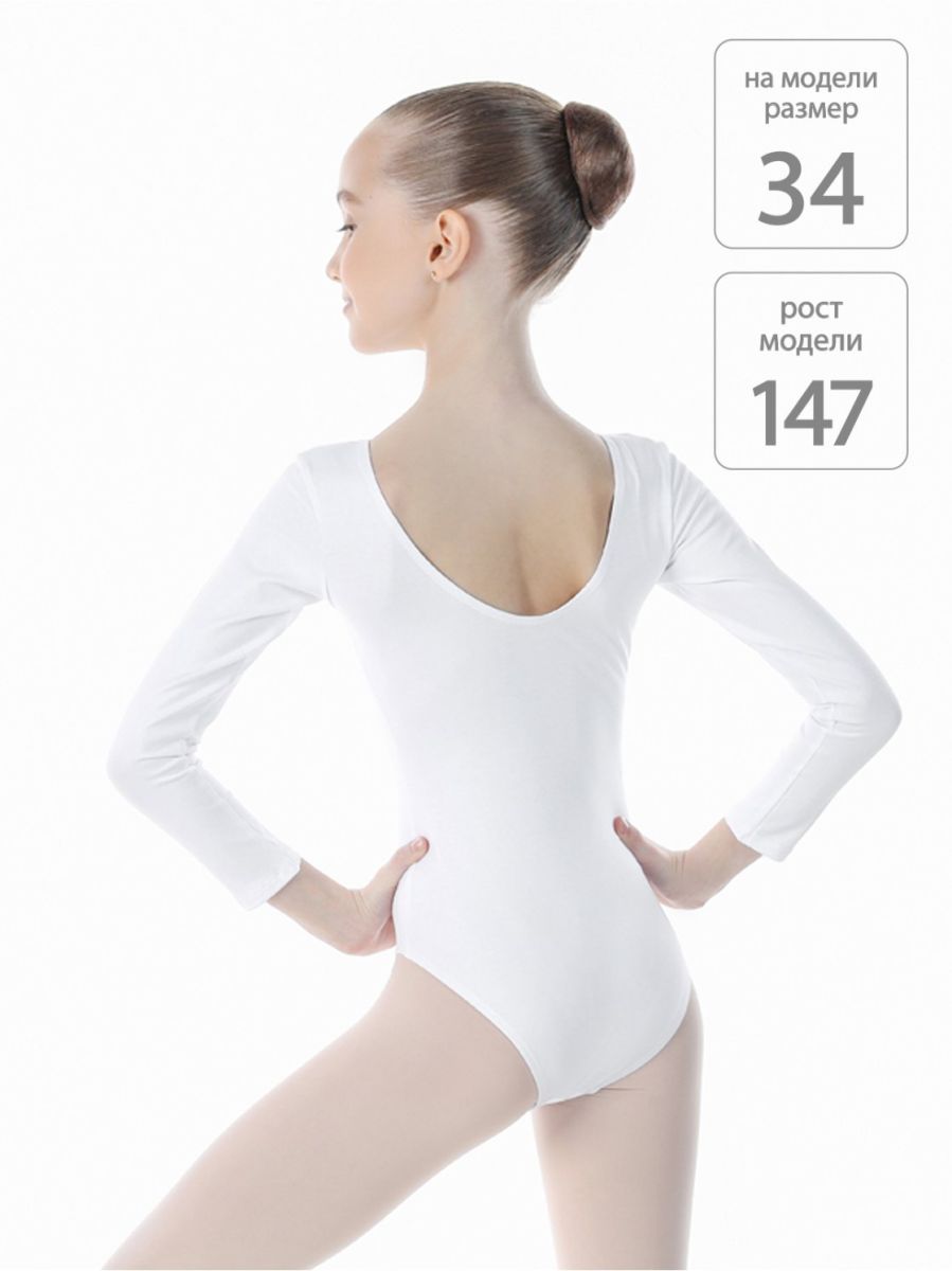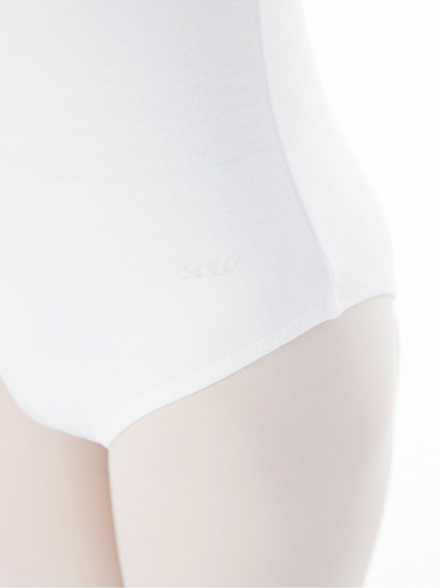 Классическая модель купальника белого цвета с длинными рукавами, круглый выкат спинки до середины лопаток и средний окат ножки. Белым перламутром нанесен логотип Solo, что подтверждает фирменность изделий.