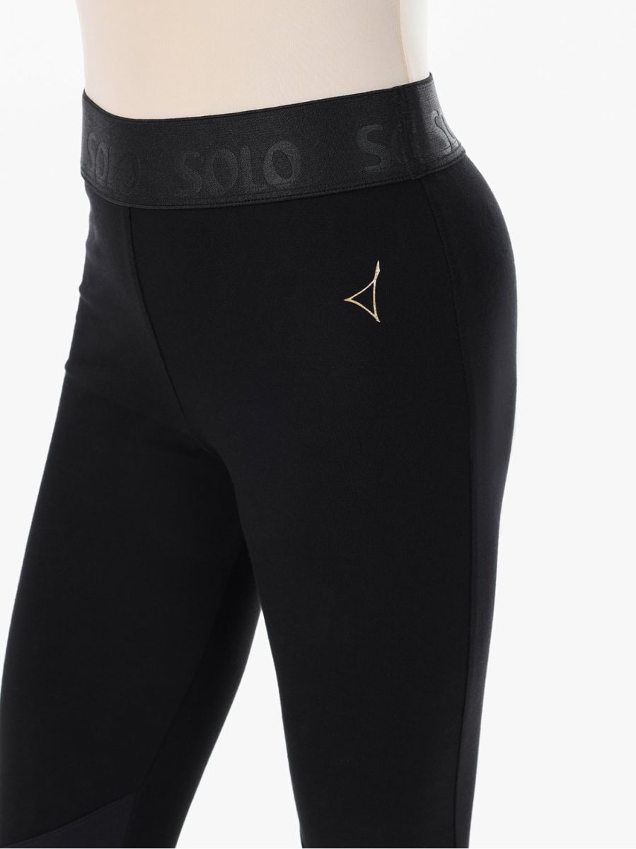 Легинсы из хлопка с функциональными вставками из мерила. *Комбинирование атласных и матовых фактур. *Вставки из мерила в области колена и штрипки *Широкий пояс с атласным тиснением логотипа Solo Изделие подходит для тренировок любой интенсивности.