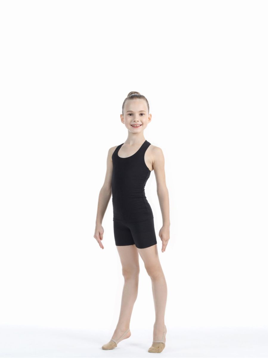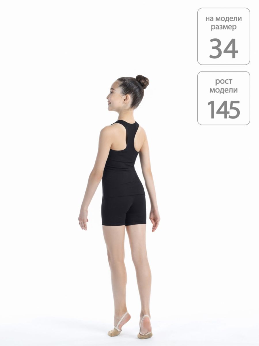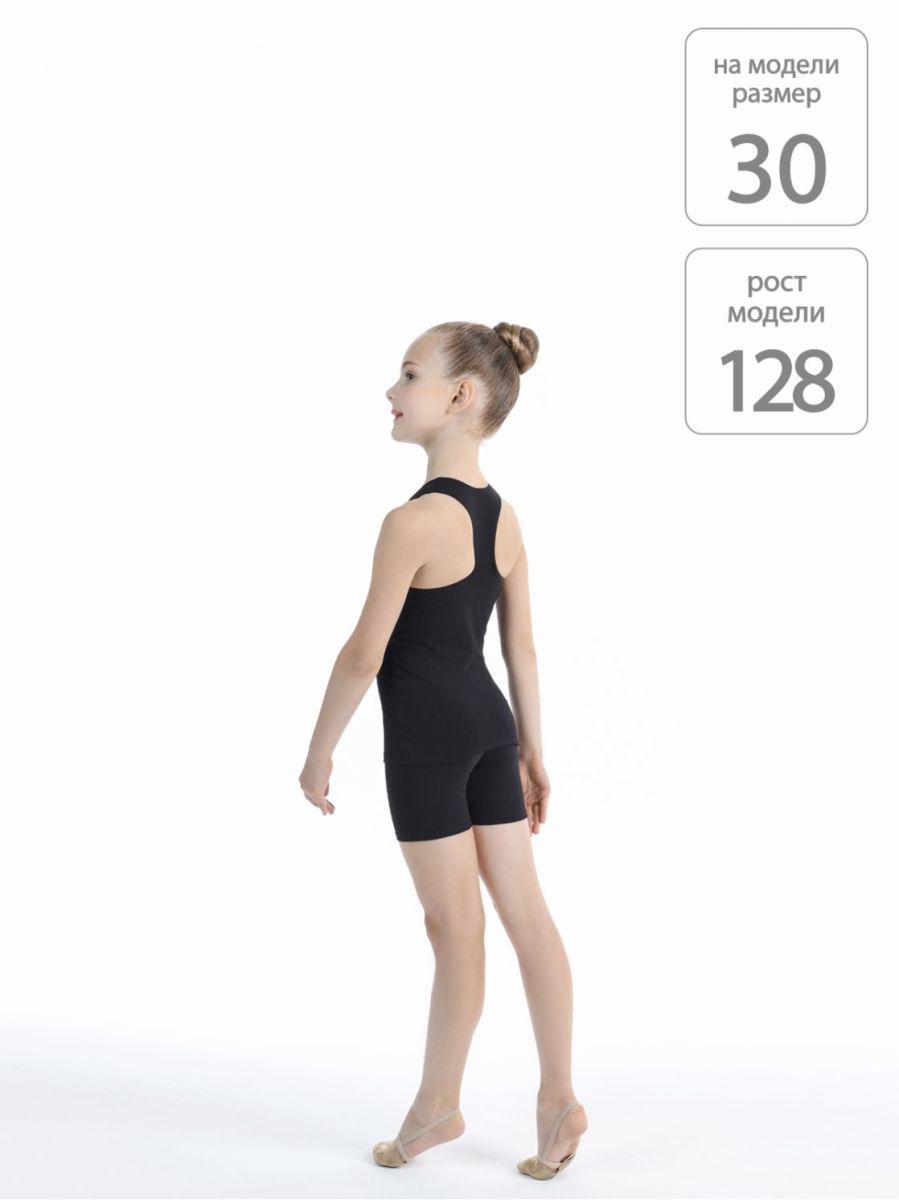 Чёрная майка-борцовка прилегающего силуэта. Ширина бретелей около 3 см. Без поддержки для груди. Подходит для занятий танцами, художественной гимнастикой и другими видами спорта.