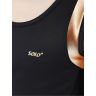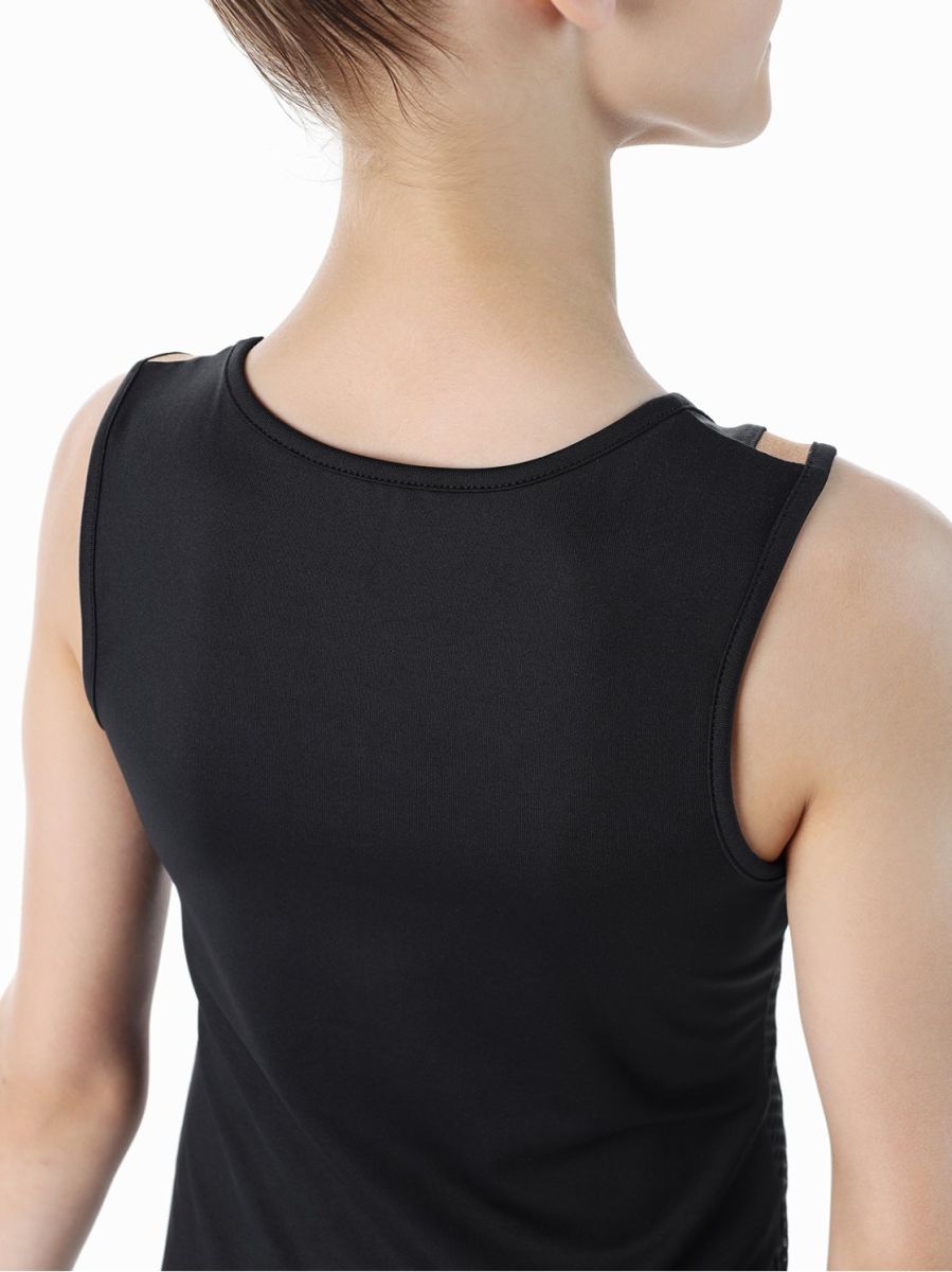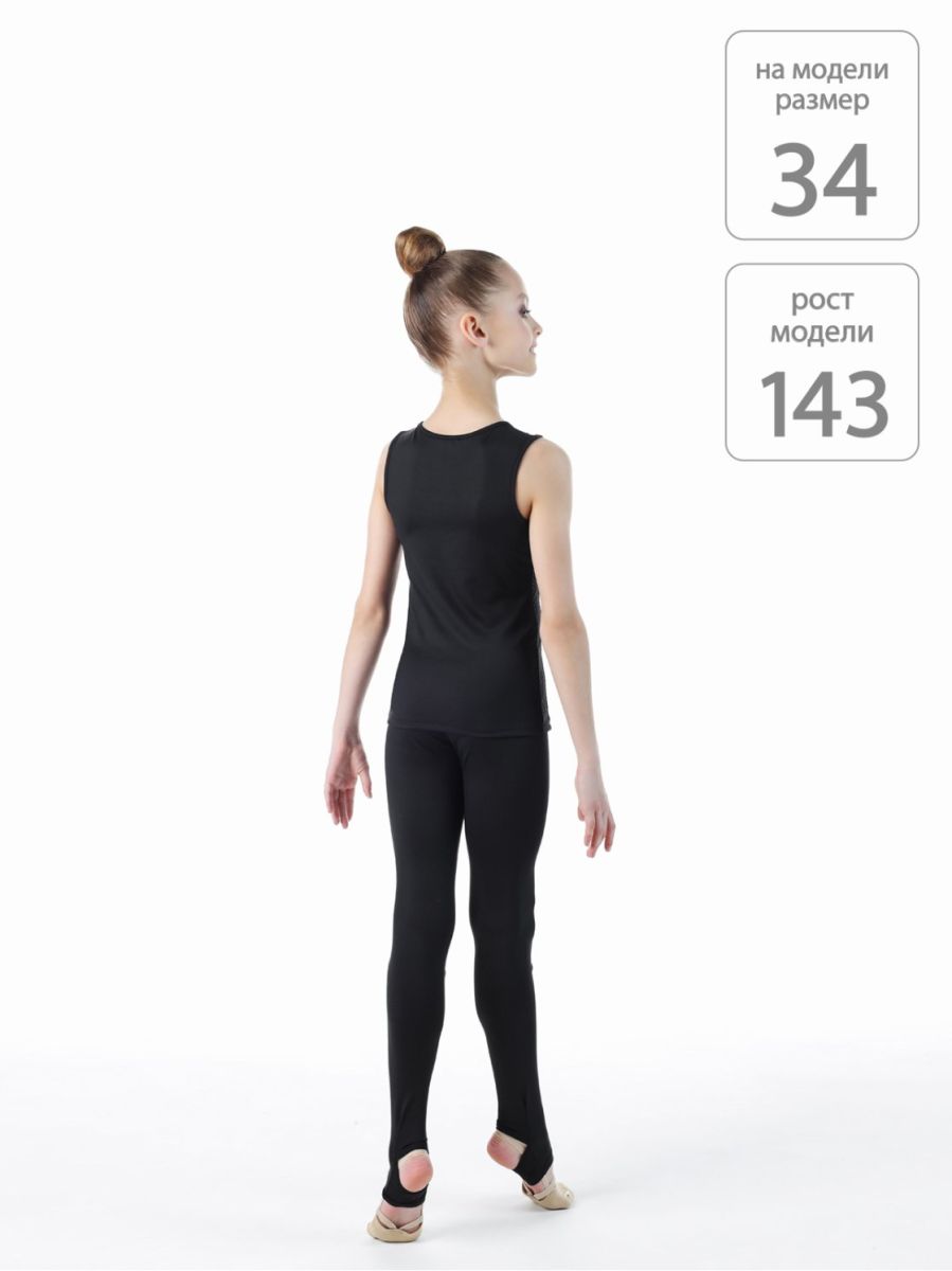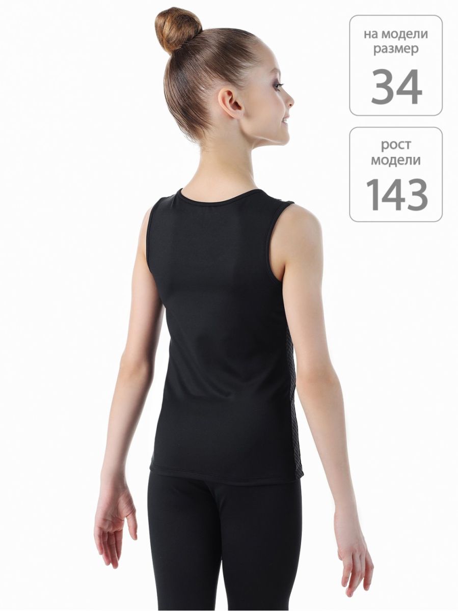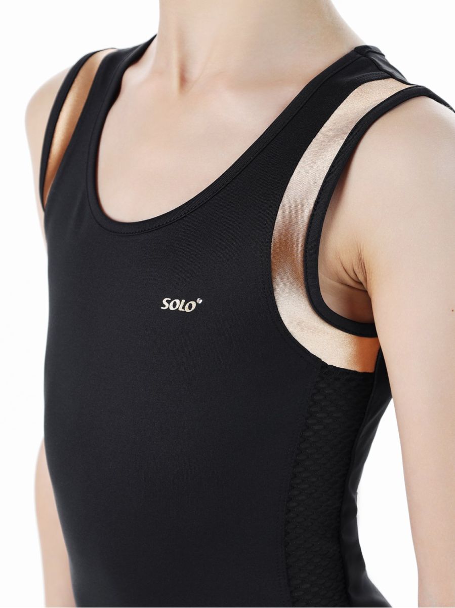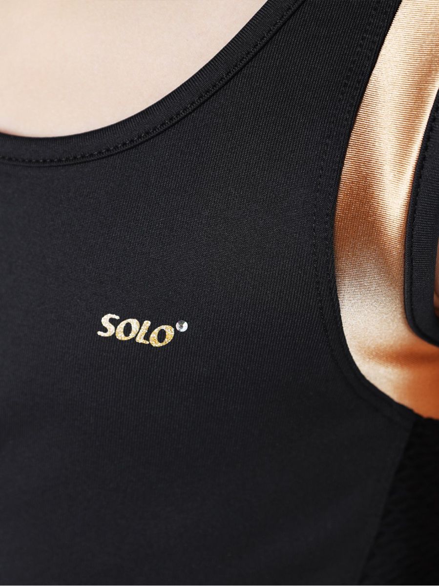 Облегающая майка с закрытыми лопатками. Сочетание трёх фактур разного цвета: *матовый чёрный полиамид Meryl *глянцевая золотая отделка *полупрозрачная чёрная «сетка» *золотистый лого SOLO со сверкающей стразой. Комбинирование коллекции «Звезда Solo» с другой продукцией нашего бренда позволит восходящим юным «звездам» создать образы в стиле СПОРТ+МОДА.