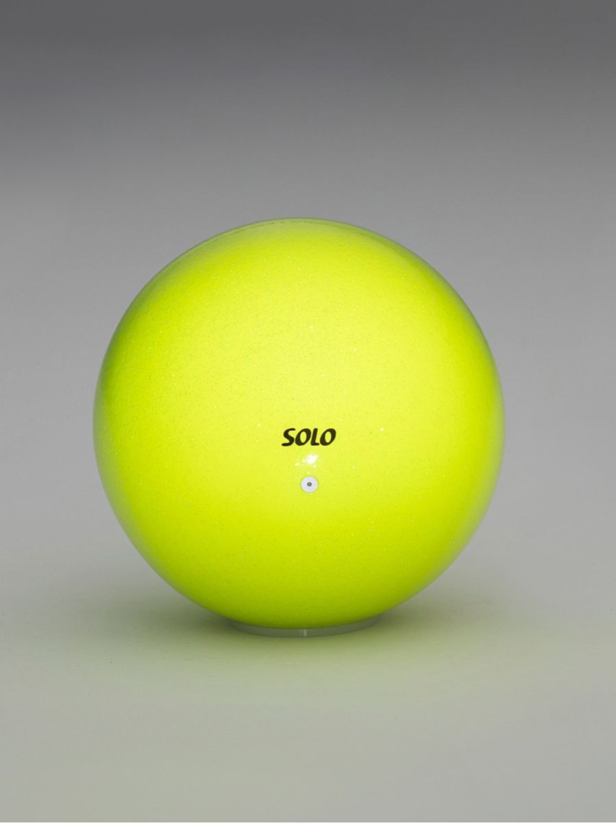 Цветовое описание: яркий флюоресцентный лайм Логотип: чёрный Тип блёсток: светящиеся Доступные размеры: — 16 см — для юных гимнасток (вес ~300–330 г); — 17 см — для тренировок и отработки техники (вес ~340–370 г). Профессиональный гимнастический мяч SOLO — это сочетание эстетики, надёжности и точной физики отскока. Разработан с учётом требований как начинающих спортсменов, так и опытных гимнасток. Ключевые преимущества: — Идеальное липкое покрытие: уверенное сцепление с ладонью, меньше усилий при контроле — Точная балансировка: стабильная траектория, предсказуемый отскок — Яркий цвет и многослойные блёстки: визуальный объём и глубина сияния — Универсальность: подходит как для младших групп, так и для продвинутых гимнасток — Материал: эластичный, устойчивый к деформациям и стиранию — Оптимальный вес: соответствует стандартам тренировочного инвентаря