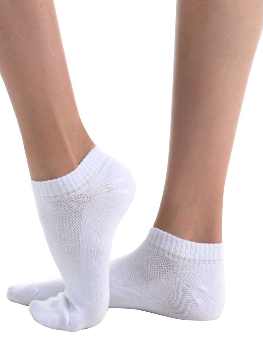Белые укороченные носки высотой до косточки. Сверху сеточка, гладкий след, кеттельный шов, вышивка Solo на подошве. Предназначены для эпизодического использования на спортивных тренировках. Цена указана за пару.