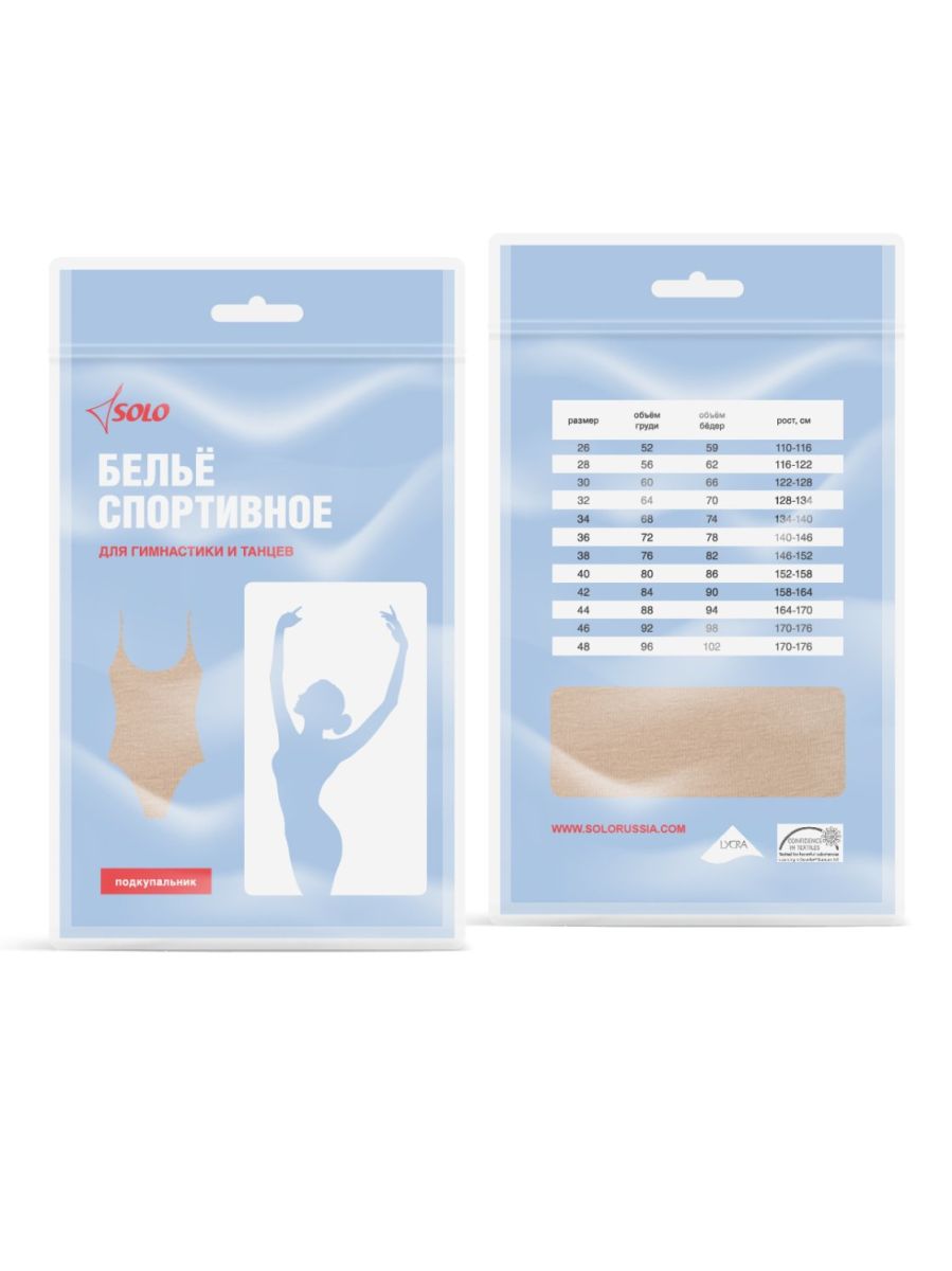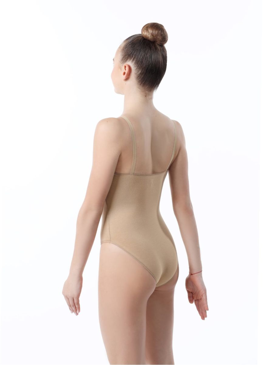 Подкупальник (патрон) цвета загар с эластичными бретелями и хлопковой ластовицей. Прямой выкат спинки, открытые лопатки, высокий окат ножки, край оката обработан силиконовой лентой.