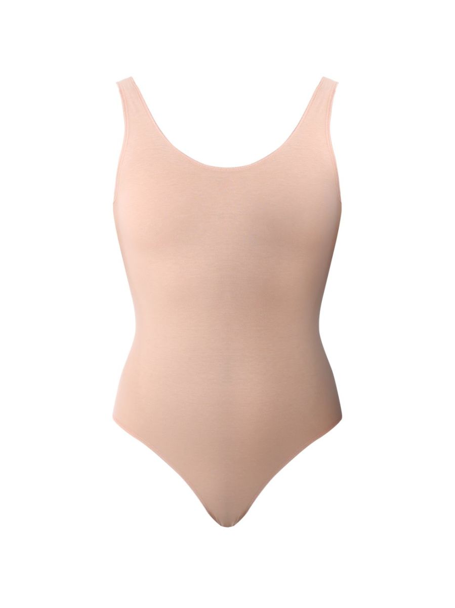 Подкупальник (патрон) бежевого цвета на широких лямках, с хлопковой ластовицей. Глубокий выкат спинки, открытые лопатки, высокий окат ножки, край оката обработан силиконовой лентой.