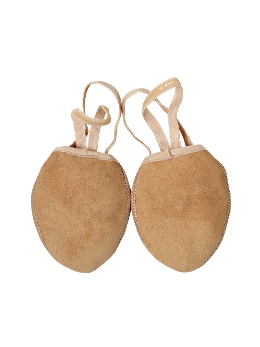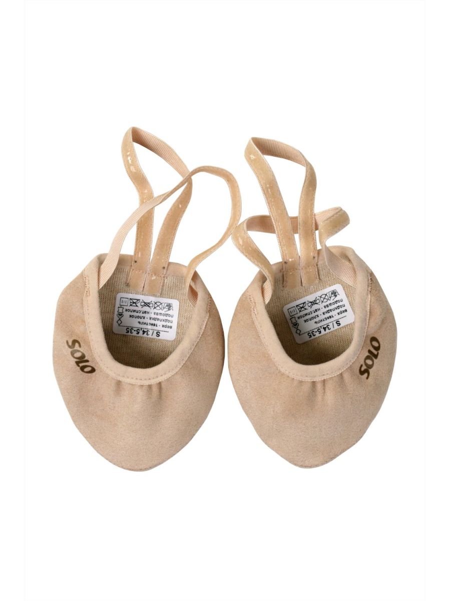 Получешки (полупальцы) для гимнастики из комбинированных материалов телесного цвета. Верх – искусственная замша, низ – натуральный спилок, идеальный для выполнения пируэтов. Подушечка из поролона отсутствует, подкладка хлопковая. Плоский шов встык делает получешки очень комфортными в ношении. Резинки с нанесением силикона надёжно фиксируют получешки на ноге, обе резинки пришиты. Нанесён логотип Solo.