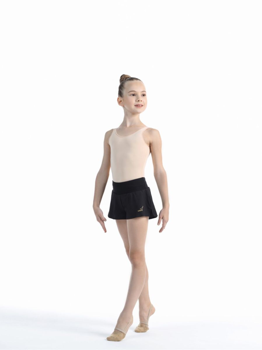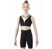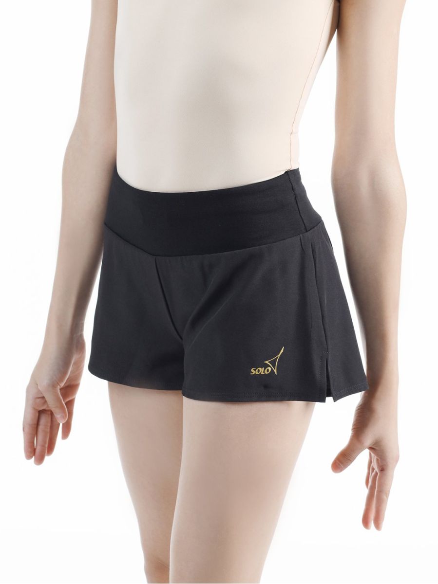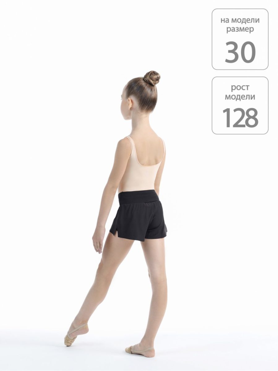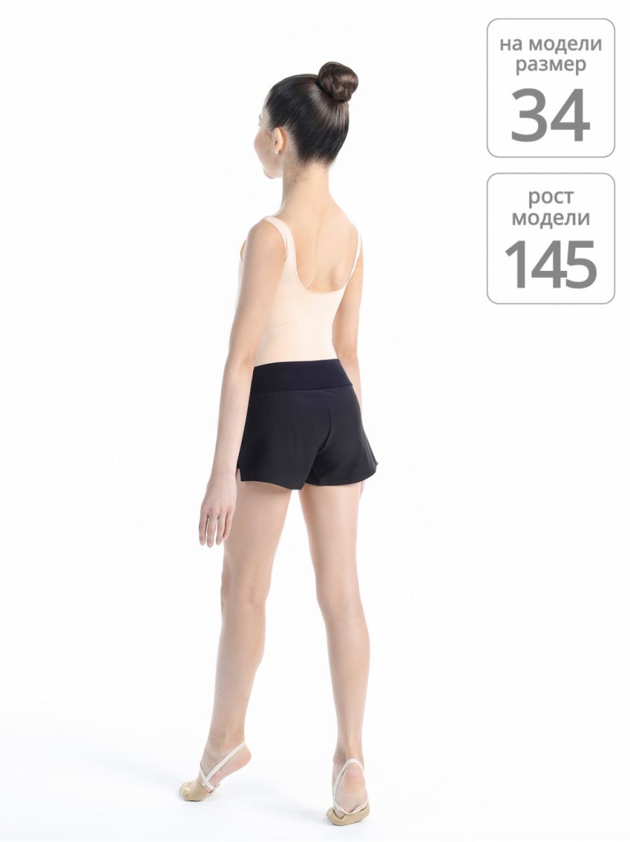 Двойные шорты чёрного цвета. Верхние шорты свободные, выполнены из лёгкого полотна (полиэстер с эластаном), нижние шорты облегающие (хлопок с эластаном). Широкий мягкий пояс с дополнительной фиксацией резинкой. Подходят для занятий художественной гимнастикой и танцами.