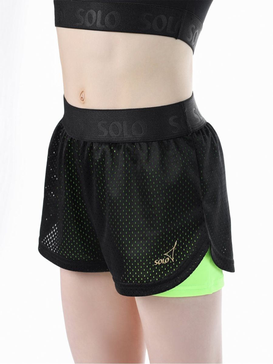 Шорты двойные: нижние- облегающие из яркого полиамида, верхние- свободные из трикотажной сетки. Гладкий плотный пояс из эластичной ленты с атласным тиснением лого Solo. Особый крой для свободы и эстетики движений. Золотистый логотип Solo. Идеально подходят для всех видов танца, художественной гимнастики и других гибких видов спорта.