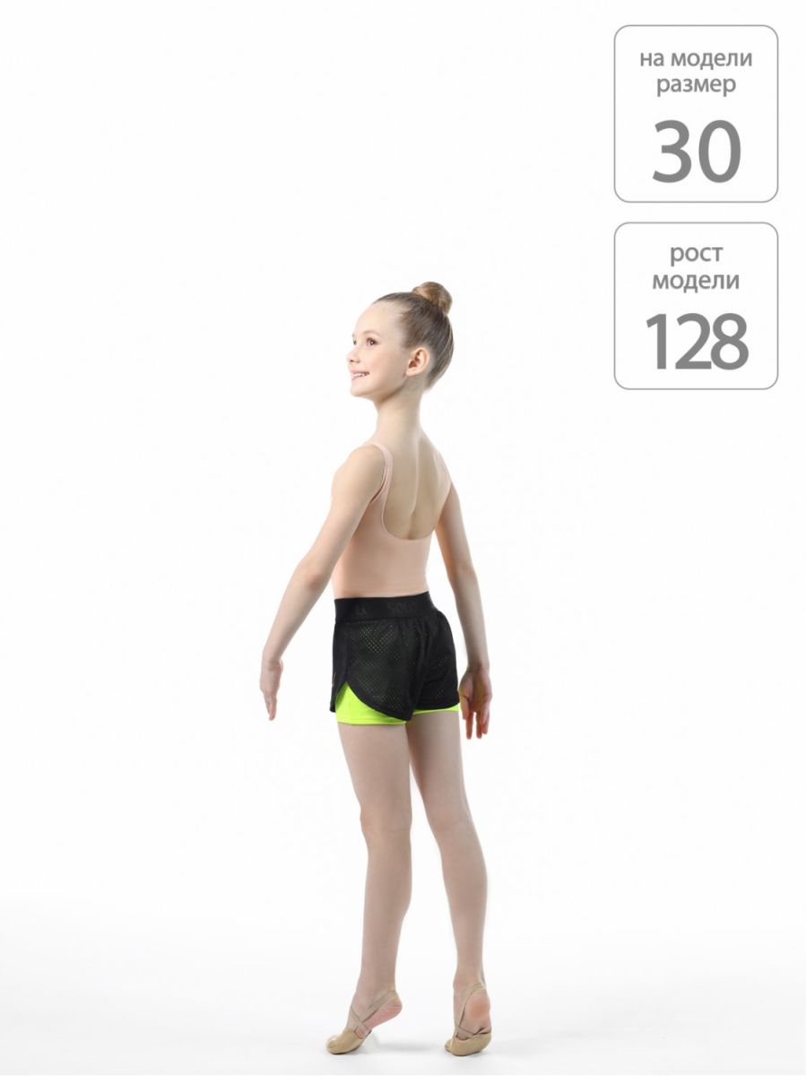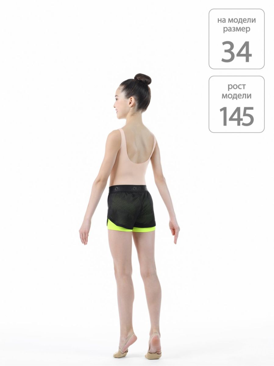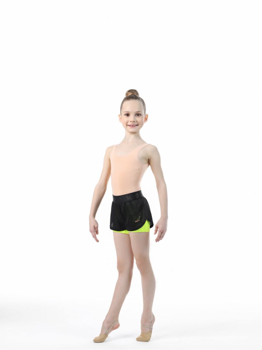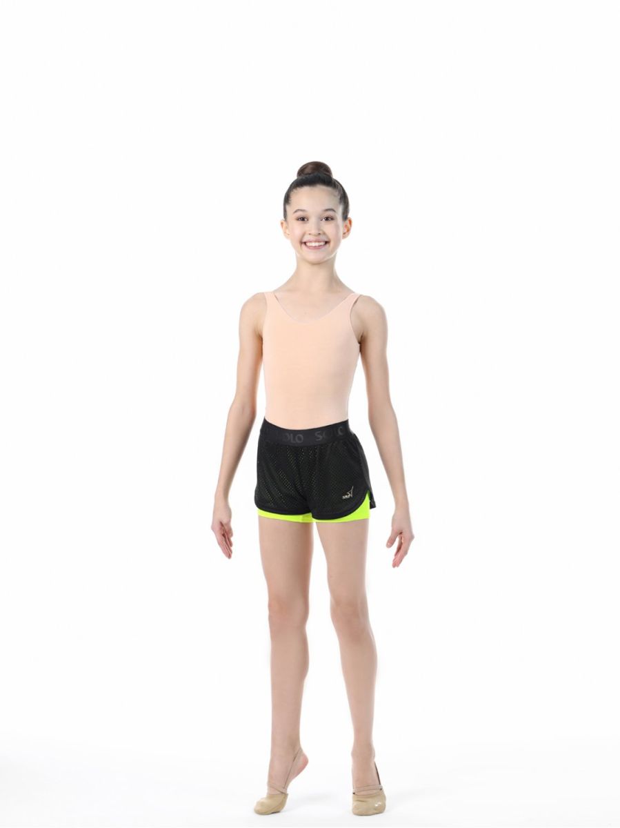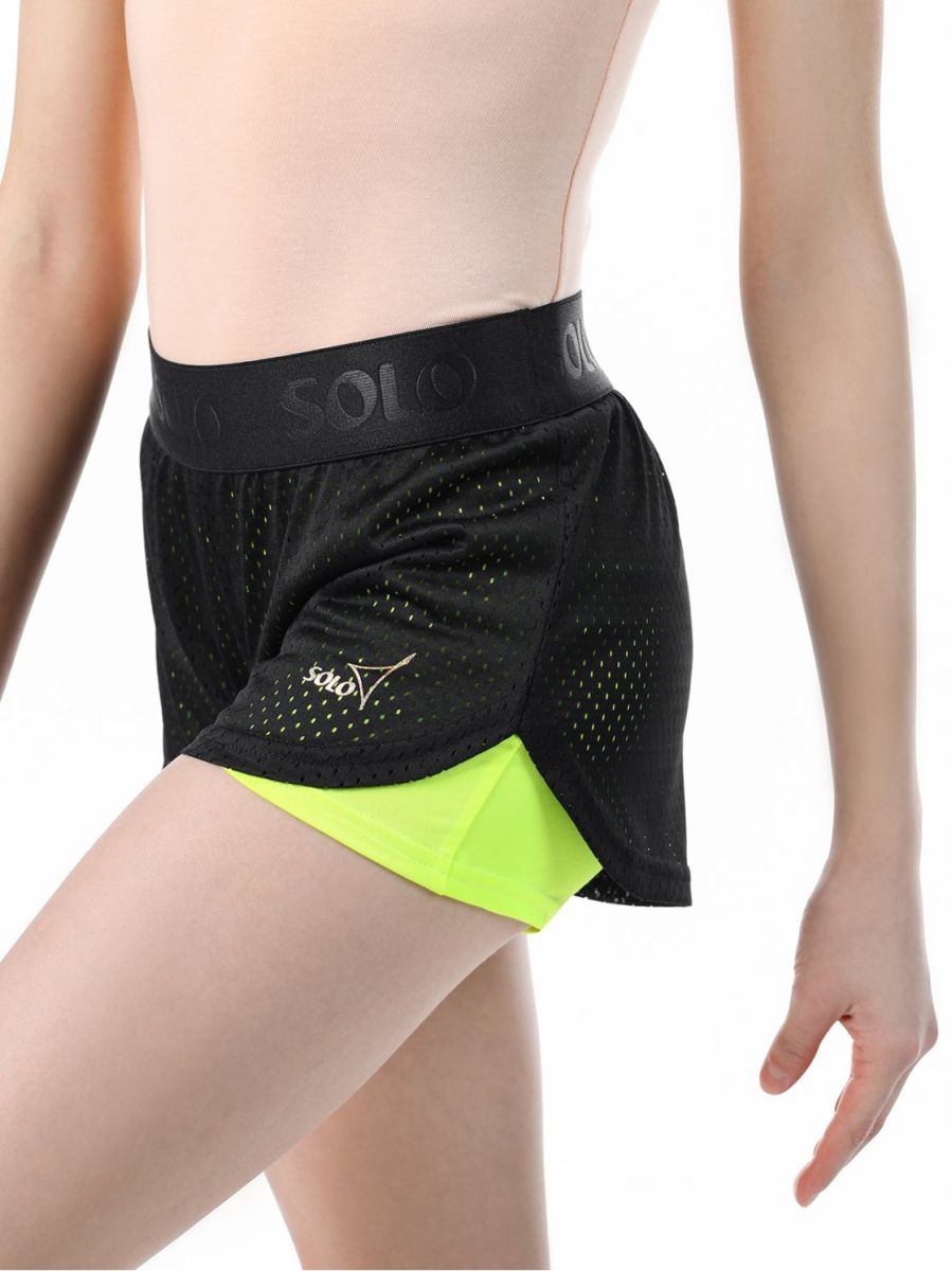 Двойные короткие шорты: верхние – свободные, из чёрной трикотажной сетки, нижние – облегающие, из эластичного полиэстера цвета неонового лайма. Гладкий плотный пояс из эластичной ленты с атласным тиснением лого Solo. Особый крой для свободы и эстетики движений. Золотистый логотип Solo. Идеально подходят для всех видов танца, художественной гимнастики и других гибких видов спорта.