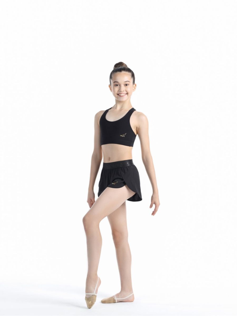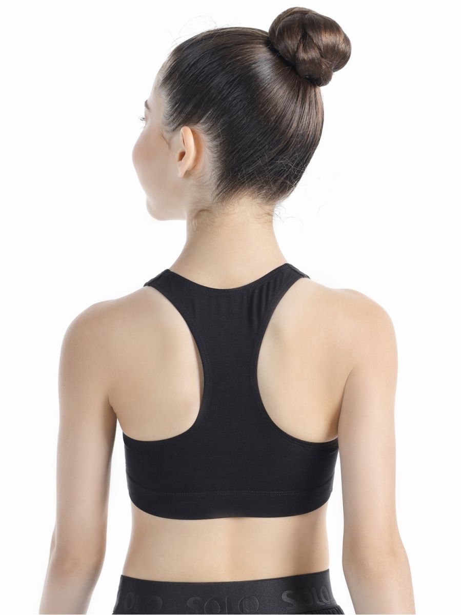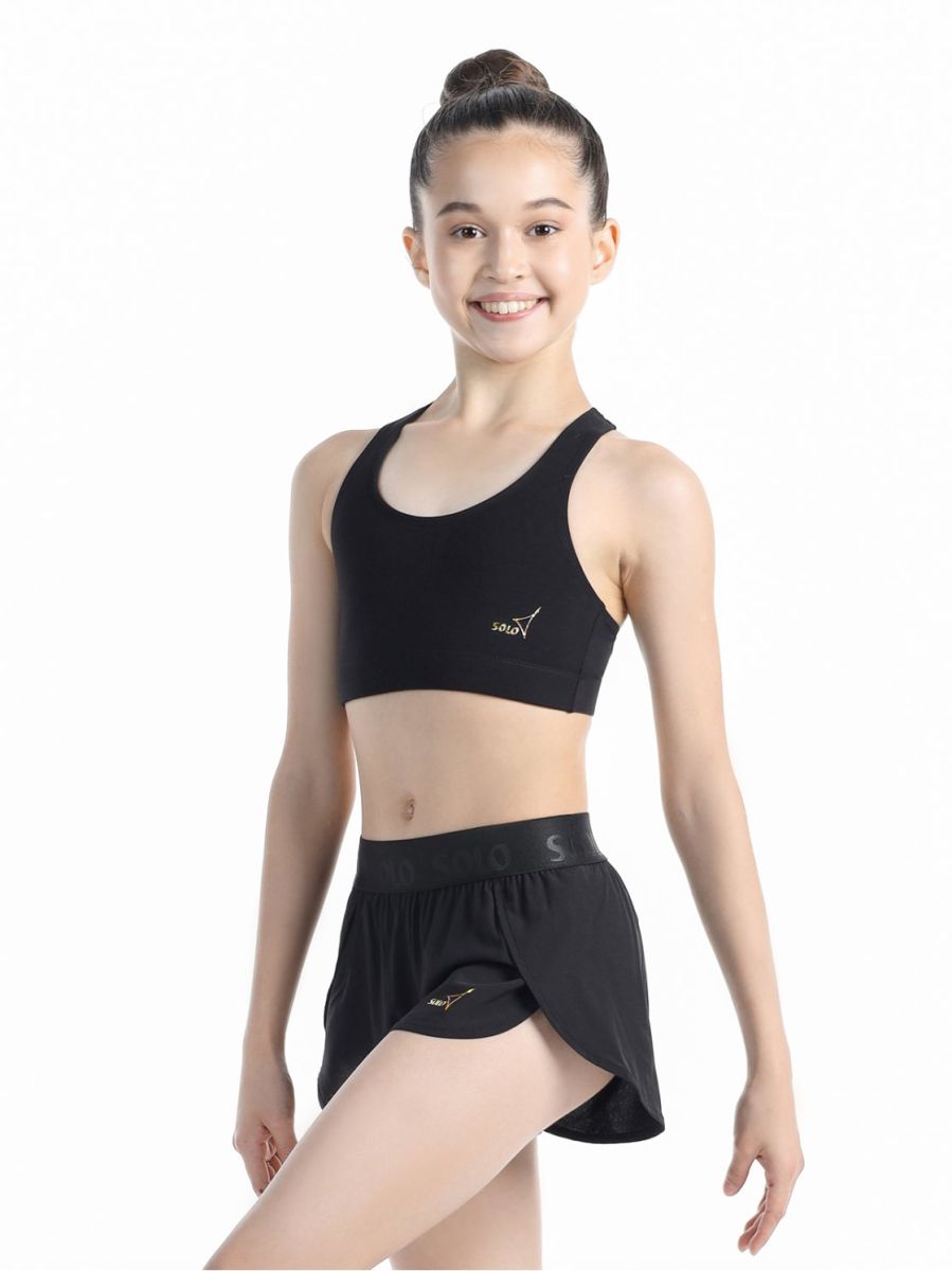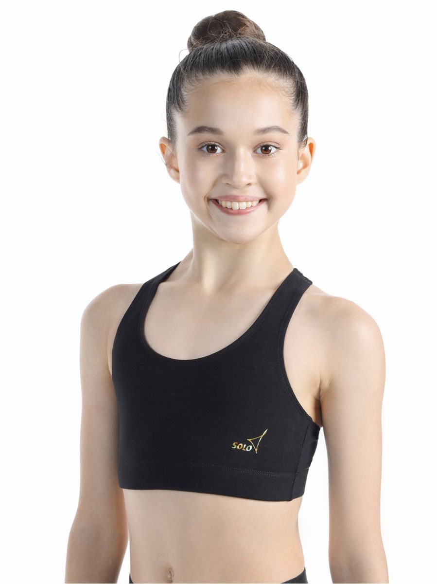 Топ-лиф с подкладкой переда и спинкой-борцовкой. Резина под грудью. Золотистый логотип SOLO 3х3см внизу слева. Благодаря двойному переду обеспечивает надежную фиксацию груди, необходимую при занятиях спортом, гимнастикой и танцами.