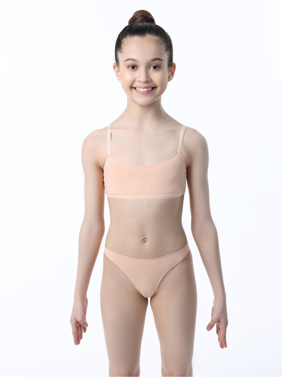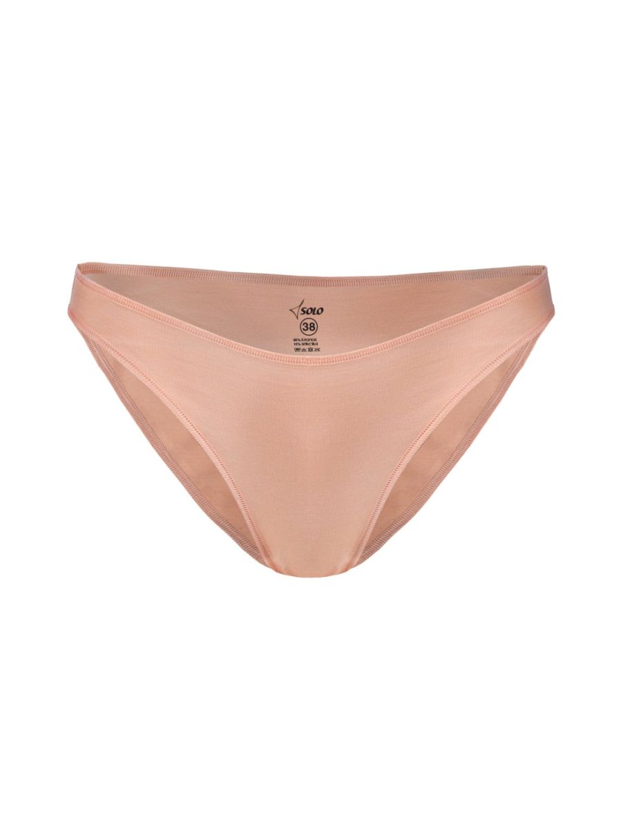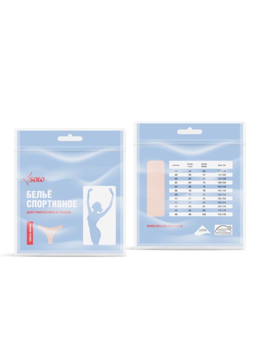 Трусики-мини бежевого цвета с высоким окатом ножки и хлопковой ластовицей. Края изделия обработаны силиконовой лентой, узкий бочок.