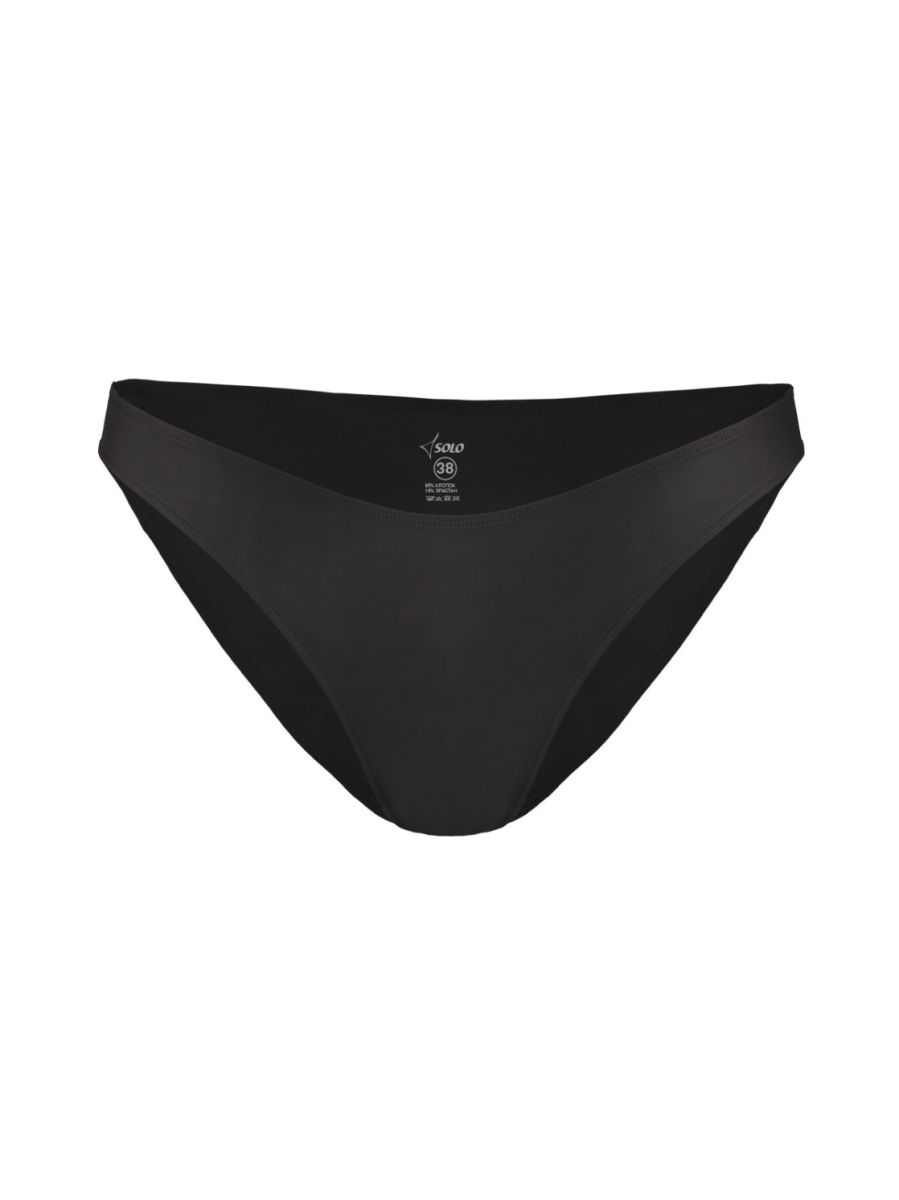 Трусики-мини чёрного цвета с высоким окатом ножки и хлопковой ластовицей. Края изделия обработаны силиконовой лентой, узкий бочок.