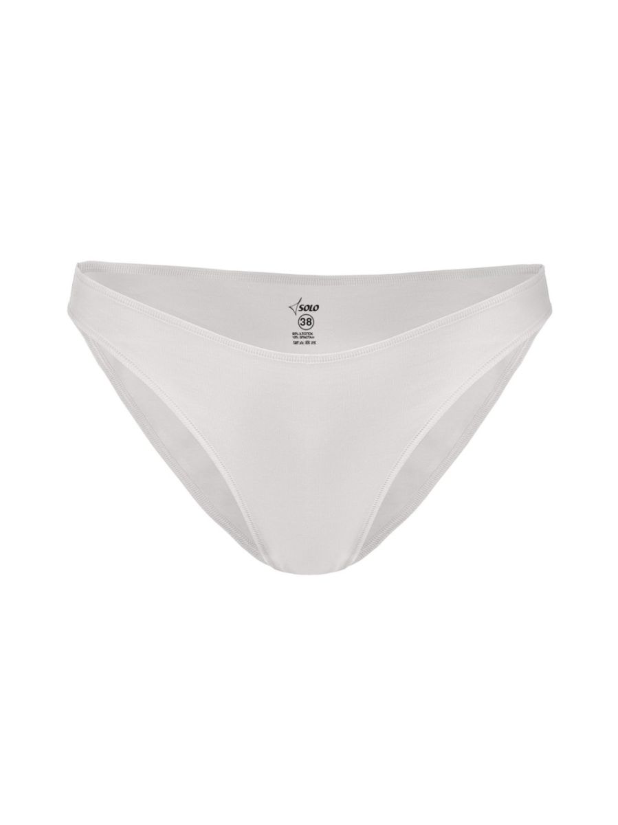 Трусики-мини белого цвета с высоким окатом ножки и хлопковой ластовицей. Края изделия обработаны силиконовой лентой, узкий бочок.