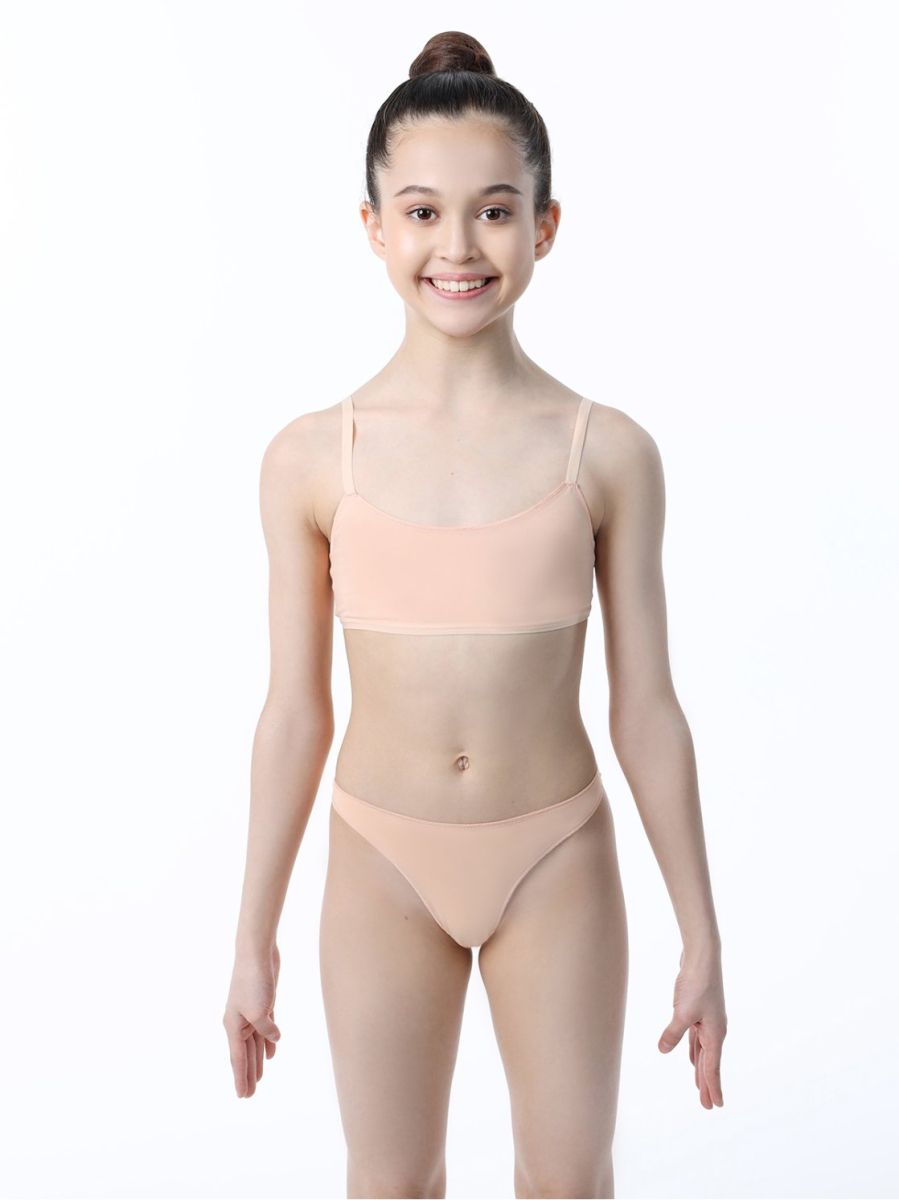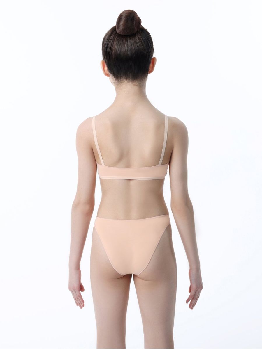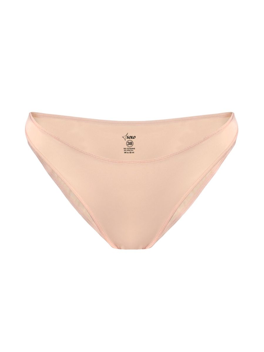 Трусики-мини бежевого цвета с высоким окатом ножки и хлопковой ластовицей. Края изделия обработаны силиконовой лентой, узкий бочок.